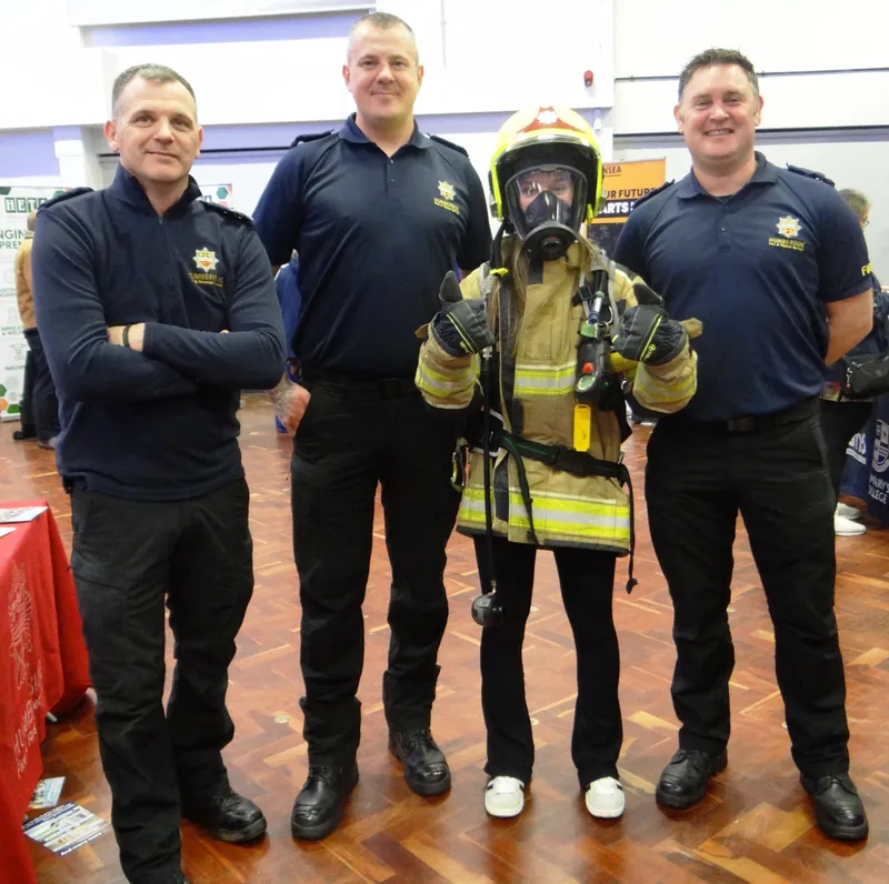 ABOVE: Getting a taste of life as a firefighter, Year 11 student Darcey tries on full firefighting kit alongside Humberside Fire and Rescue’s Carl Frith, Will Lawton and James Danby.